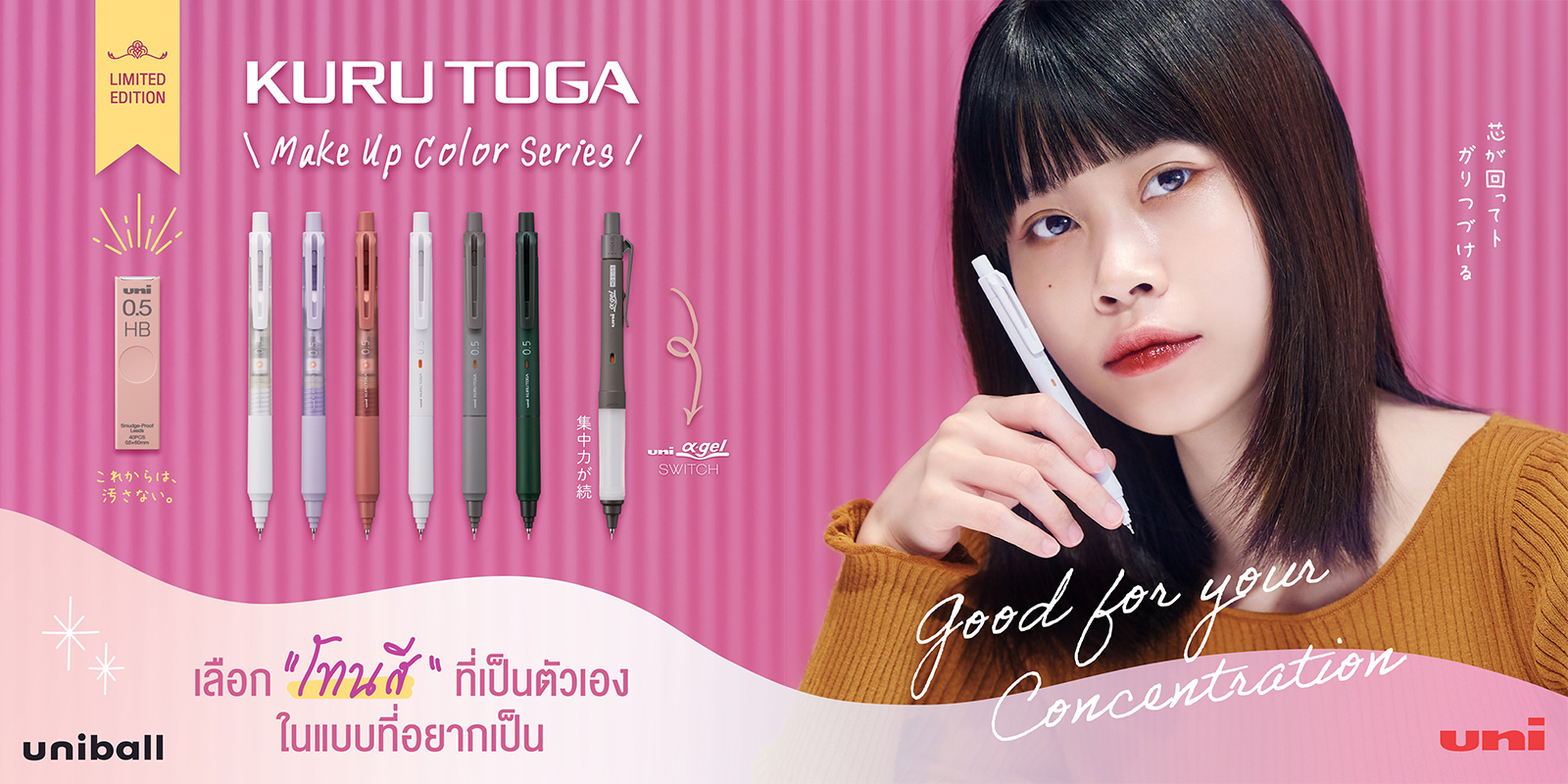 ซีรีส์นี้ถูกออกแบบมาเพื่อสร้างแรงบันดาลใจให้ผู้ใช้ เหมือนกับการแต่งหน้า เพราะทุกสีที่เลือกใช้ ก็เหมือนการเลือกเป็นตัวเองในเวอร์ชันที่อยากเป็นในวันนั้น ในซีรีส์นี้ประกอบด้วย ดินสอกด Kuru Toga รุ่น KS  |  ดินสอกด Alpha Gel Switch  | ไส้ดินสอกด uni Leads