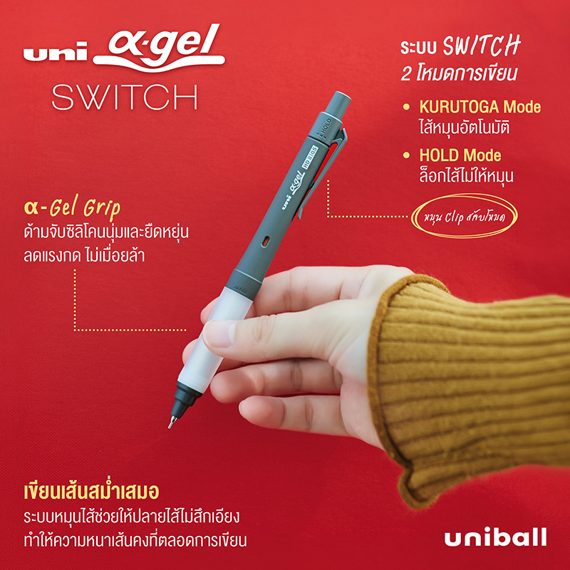 ดินสอกด Alpha Gel – ตัวช่วยสร้างสมาธิ และการจดจ่อ ด้ามจับแบบซอฟเจล นุ่มและยืดหยุ่น ช่วยลดแรงกดและลดความเมื่อยล้า ทำให้เขียนได้นานขึ้น พร้อมช่วยให้ผู้ใช้รู้สึกผ่อนคลาย แต่ยังคงตื่นตัวและจดจ่อกับสิ่งตรงหน้าได้ดี เหมาะทั้งการเรียนและการทำงาน มาพร้อมระบบ Switch สองโหมดการเขียน โดยหมุนที่คลิป