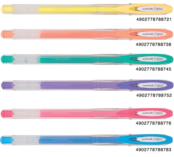 Signo gel pen ensures constant ink flow without blurring or dripping. Waterproof pigment ink with a 0.7mm line, available in 8 pastel colours.